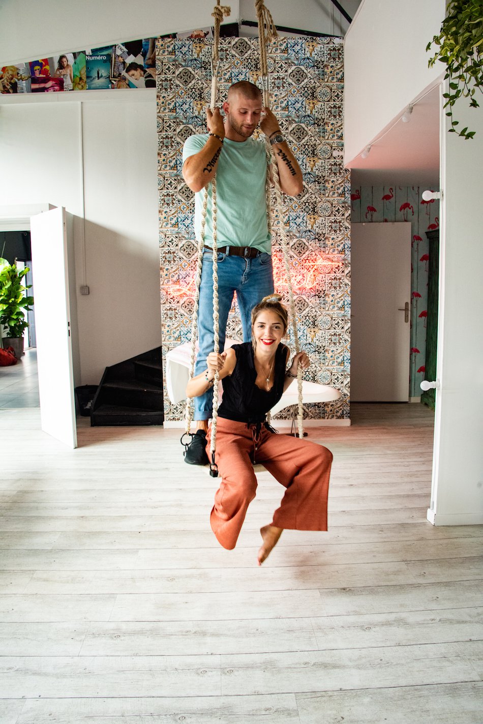 Difficile d’imaginer qu’une petite rue montreuilloise cache une telle pépite. Derrière la grande porte verte du 25, rue Douy-Delcupe, Florian nous dévoile ce qui rendrait jaloux n’importe quel Parisien en mal de calme : un salon d’été, avec ses canap’ moelleux et son ambiance chill. À l’intérieur, on ne sait plus où donner de la tête tant l’espace est immense. Dans la cuisine ultra contemporaine, Morgane aka « madame beauté » termine ses pancakes avant de se joindre à Florian pour nous faire faire le tour du domaine. Fauteuils, balançoires et luminaires végétaux sont suspendus au plafond pour un décor où vintage et design se marient à la perfection. Une chose est sûre, on a affaire à des gens qui ont du goût.